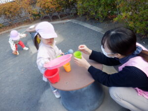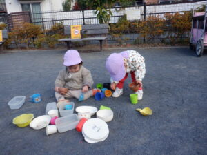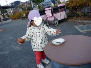 砂場がなくても、落ち葉や小石を集めて本日も「2丁目レストラン」オープン!今日のシェフのおすすめは何ですか~👂