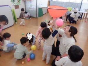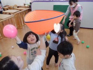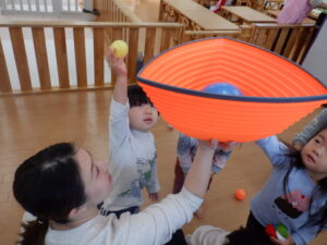 こちらは…玉入れの要領で、投げる力、目と手の協調、バランス感覚を養います!