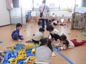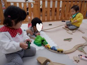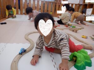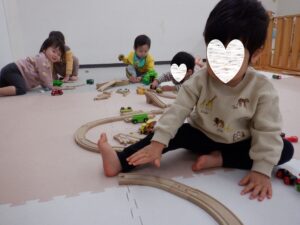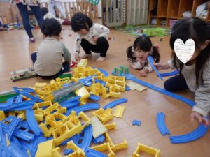 朝のお部屋遊びでは、両クラスそろって線路づくりに夢中に!