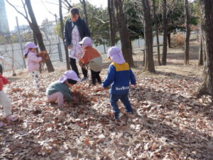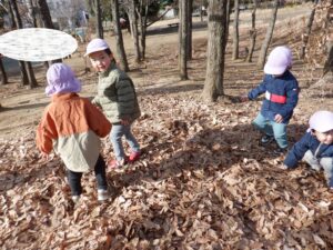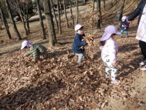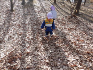たっぷり遊んで帰るころには、落ち葉のコートを着ていたのはお山だけでなく、ひまわり組さんの服や髪にも小さな葉っぱがちょこん🍂