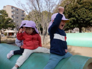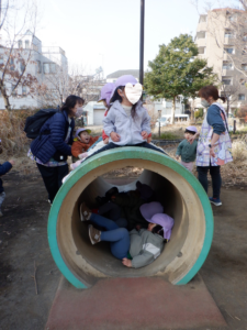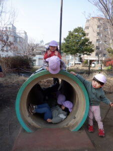 土管の上に登ってみたり、下から覗き込んでみたり、横でニコニコ見守っていたり…それぞれの楽しみ方で遊びがどんどん広がっていきました