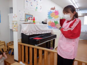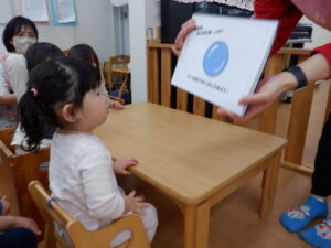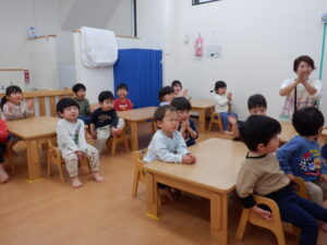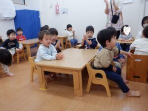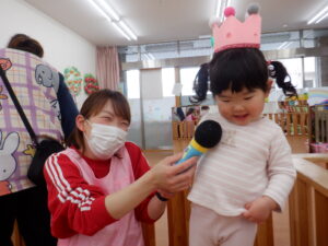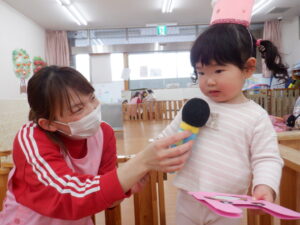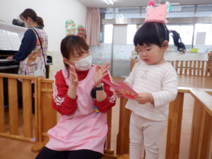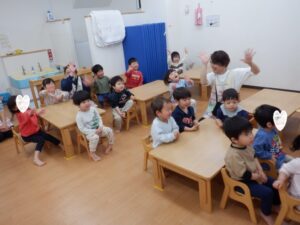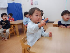 今日は2月生まれのお友だちのお誕生日会です🥰すると…「2?2歳?」と覚えたての「2」を披露してくれたHくん♡左手にもぎゅっと力が入っていてかわいいですね!