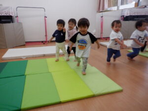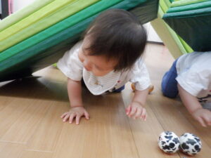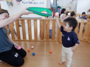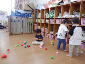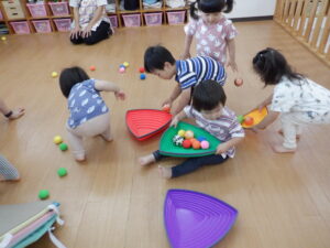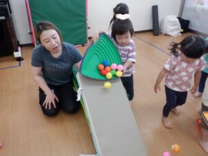 ボールは立てかけたマットに転がしたり、背伸びをして高い所に入れたり、しゃがんで集めたり・・と大人は普段何気なくやっていることですが子どもたちにとっては身体の使い方を覚えるためには大切な動きの1つ☆