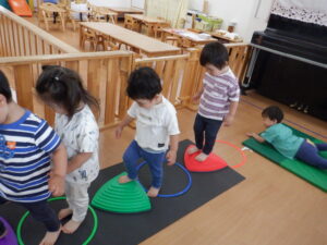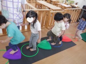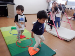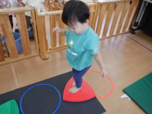 鉄棒ぶら~ん♪フープとバランスブロックの上を歩くよ~!歩くよりもブロックを動かす方が楽しそうだったのはここだけの話・・(笑)