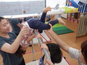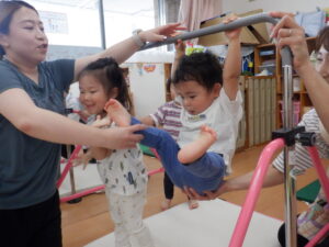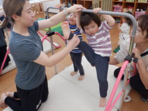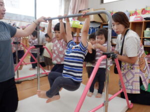 鉄棒が太くてうまく握れない時はりな先生の親指を持ってぶら~ん!鉄棒にぶら下がれなかったお友だちもこれならしっかりぶら下がることができていました!ぜひお家でも試してみてくださいね♪