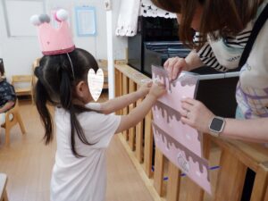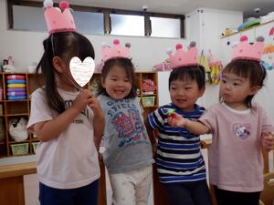 「ぼくおさんぽの帽子はちょっと苦手なんだけどこれ👑はなんかかっこいいからしっかり被っとくよ♪」というような堂々とした表情で最後まで外すことなく座っていたすみれ組のRくん👏