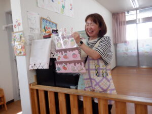 ときこ先生がつのを作っているのは、アンパンマンとばいきんまんがケーキの飾りに使うくだものを持ってきてくれたからなんです♪