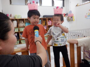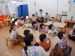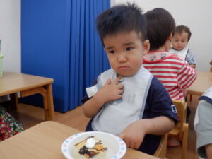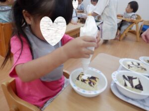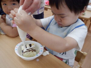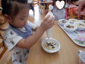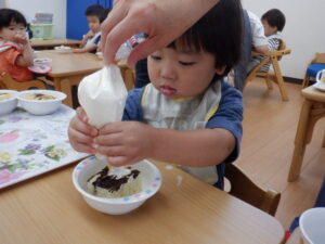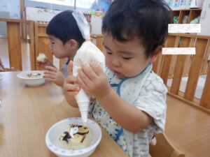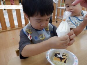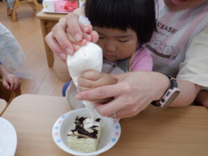 今日は8月生まれのお誕生日会!おやつのケーキにのせる生クリーム絞りをひまわり組のみんなにお手伝いしてもらいました❤