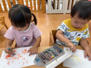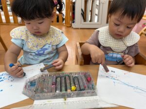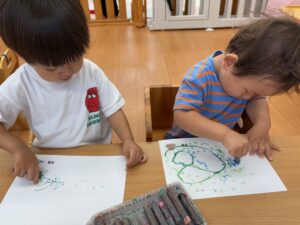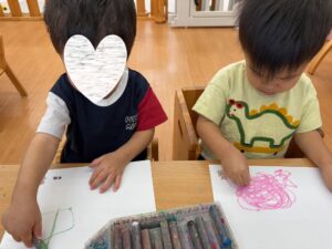 点や線、ぐるぐるや〇…進化していくクレヨン画は1年間保管し3月にプレゼントします!!