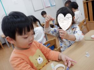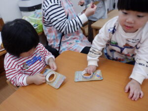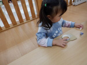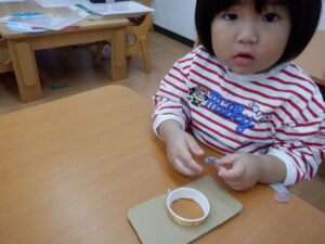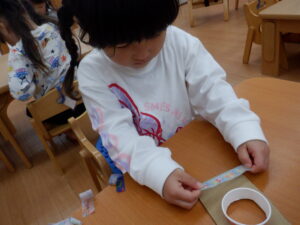 シール貼りも上手になり、今日は少し長めのマスキングテープでデコレーション☆彡しわを伸ばす手つきが成長を物語っています。
