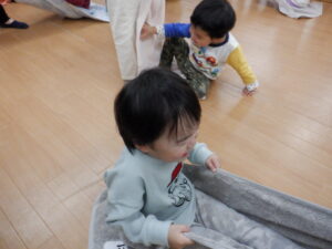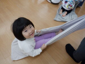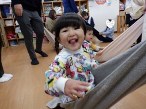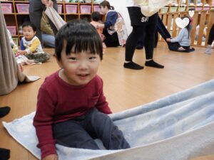 お友だちはタオルに乗ってらくちーん😆パパママ頑張って!!この嬉しそうなお顔に今度私もやってあげたいような…。でも10人分…。ひとみ先生とえみこ先生にもヘルプしてもらって3・4人…。いつかね!やろうね(笑)