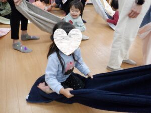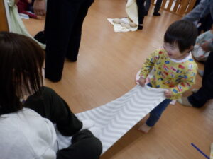 お次は親子体操ならではのタオルを使った体操です!まずはタオルを広げて…