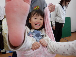 最後はタオルのお片付け。ここでもゲームの開始です!まずは半分に折ってその上に乗って…。