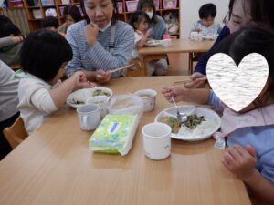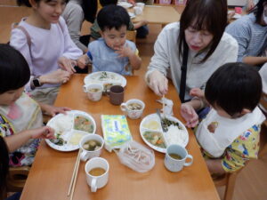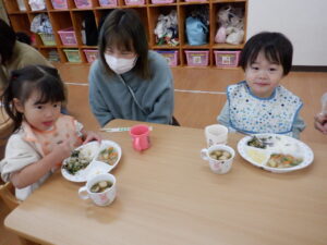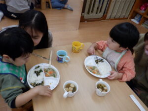 保育園に帰ってきてみんなの大好きな給食の時間です。今日の給食はいつもの1・5倍!ママにもお味見させてあげてね(^_-)-☆