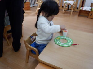 「赤がいい!」「これがかわいい!」と、ひとつひとつの選択に子どもたちの個性が表れ、同じマカロニリースでもまったく違う雰囲気に☺