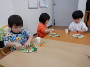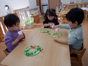 出来上がったリースを保育室の壁に飾ると一気にクリスマスムードに🎄