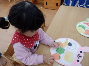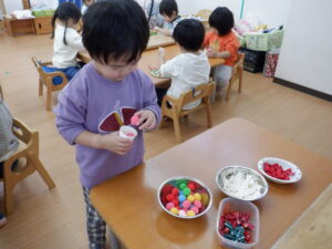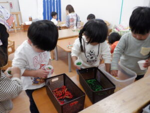 想像力いっぱいにお弁当を完成させていく姿はとても微笑ましく、見ている先生たちも思わず「食べたくなっちゃうね」と笑ってしまいました。