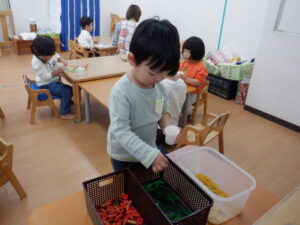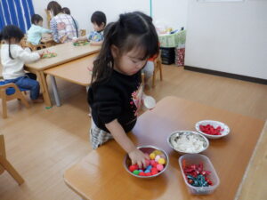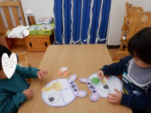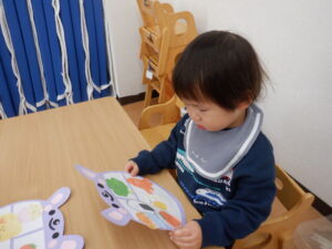 寒さが少しずつ深まる季節、子どもたちは室内での制作活動に夢中になっています。今日はクラスでそれぞれ楽しい作品づくりを行いました♩