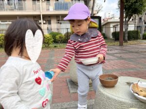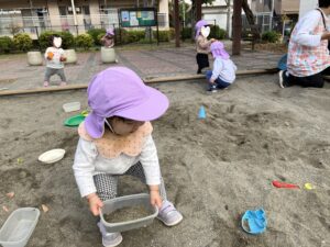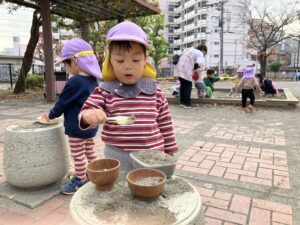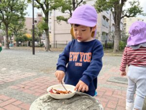 おままごとセットを広げると、子どもたちはすぐに「レストラン開店!」とばかりに砂をこねこね。
