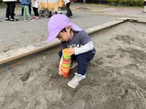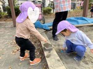 今日も子どもたちは、砂場でのんびり、落ち葉でサクサク、探検でドキドキと…