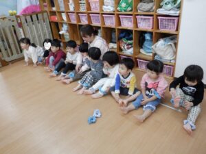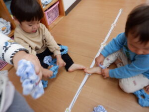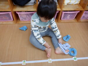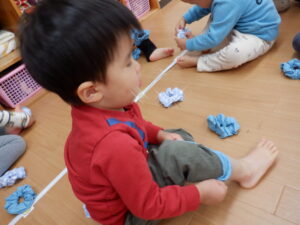シュシュを足にはめる運動は靴下をはく練習につながるもので、地味に体幹が整わないと難しい動作だったりします…!!