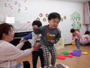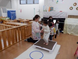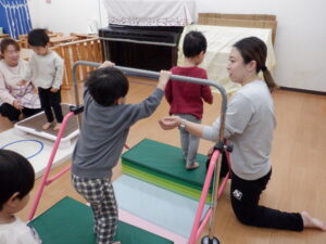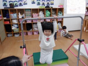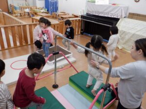 体をしっかりゆらさないと次のマットに渡れない運動で、腕の力や体幹を育てながら「できた!」という達成感を味わいます