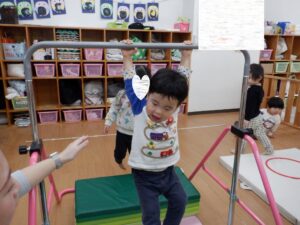 鉄棒やマットでは大冒険!ジャンプはスーパーヒーロー!みんながとても楽しそうなので、先生たちも笑いながら見守りました