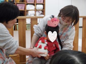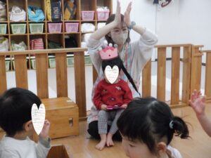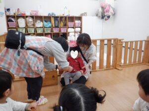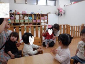 今日は1月生まれのお誕生日会🎵 お椅子に座っている時にお名前を呼ばれると「はーい」と手を挙げて元気にお返事してくれたHくんでしたが、みんなの前に出るとちょっぴり恥ずかしくなってしまった様子😆なので佐藤と一緒にお返事❤でも、お膝の上の手はちゃんとパーにしてお返事したい気持ちはあったよね♡
