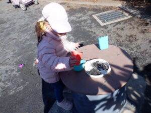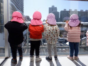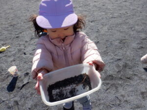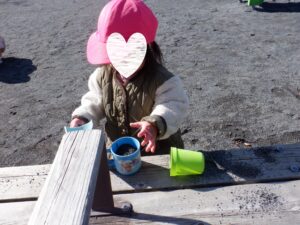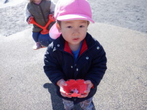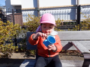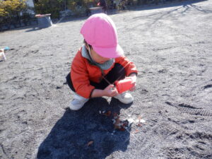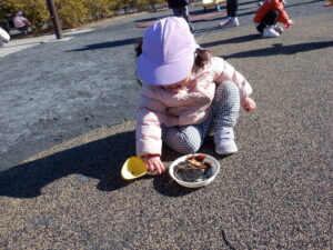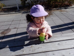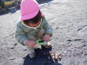昨日の雪が残る中のお散歩は子どもたちにとって「いつもと違う」楽しみがあったようです♡
