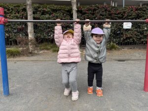 最後はみんなでぶら下がりごっこ~!鉄棒はぶら下がることで、子どもの腕や手肩の筋力をつけたり、体をまっすぐに保って体幹を鍛えることができます✨