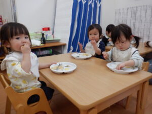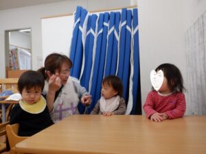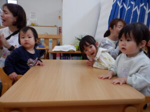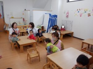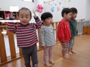 ひまわり組のお当番は今のところ立候補制(笑)「やりたいお友だちー!?」と声をかけるとこんな感じで前に並んでくれます👏