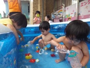 プールにも慣れたお友達が多く、道具を使ってお水を掛け合ったり、