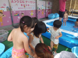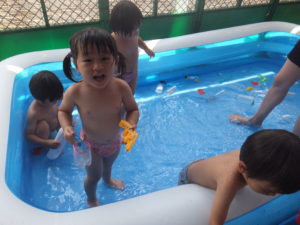 全身水につかってバタ足をしたり、ぞうさんじょーろやペットボトルのシャワーで霧吹きしたりして、今日も楽しかったね~!!