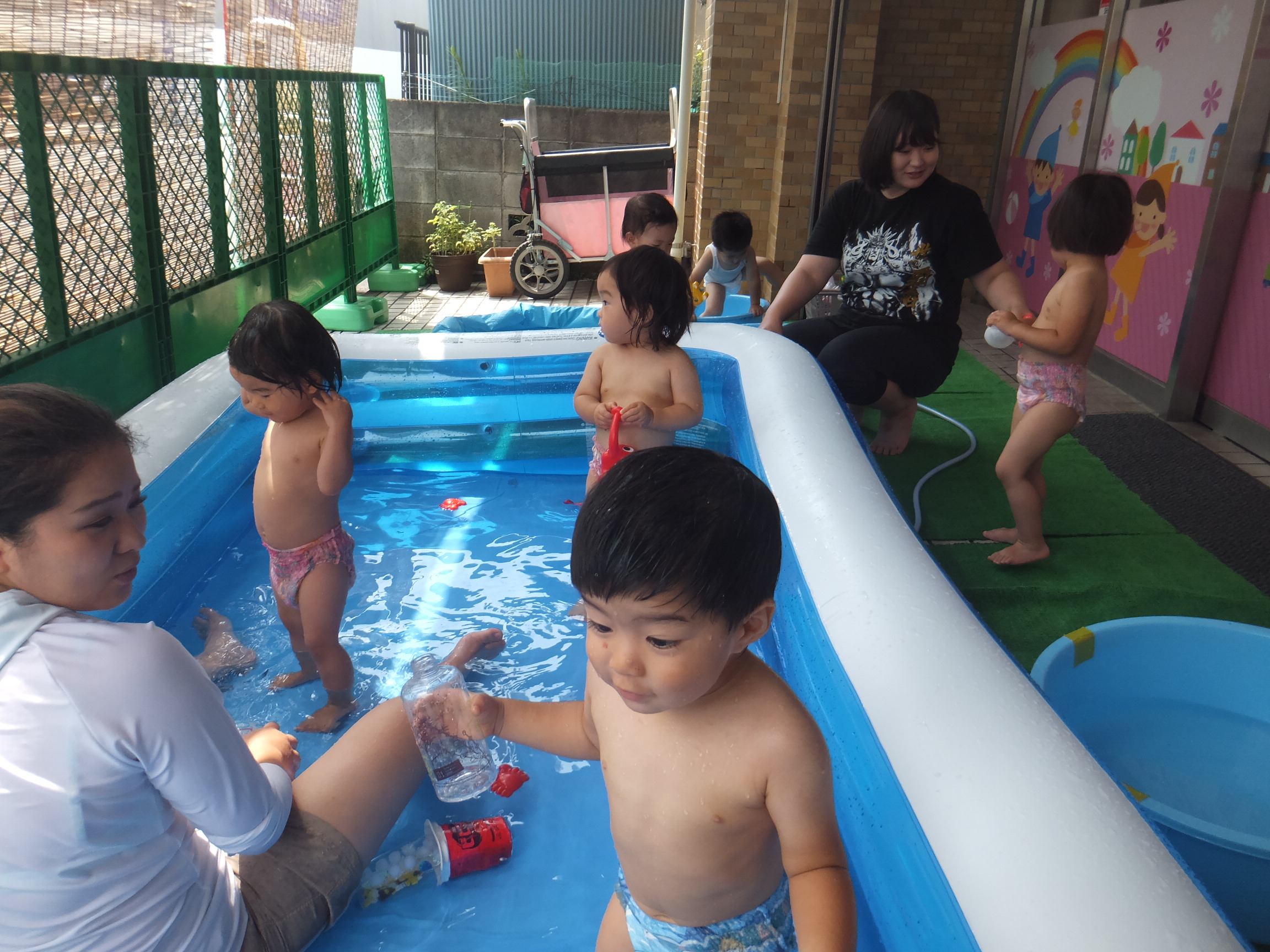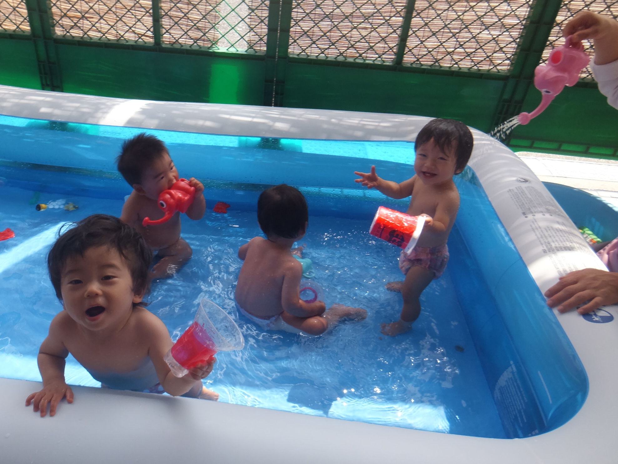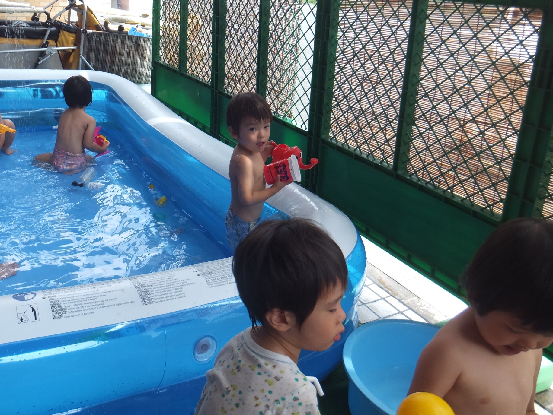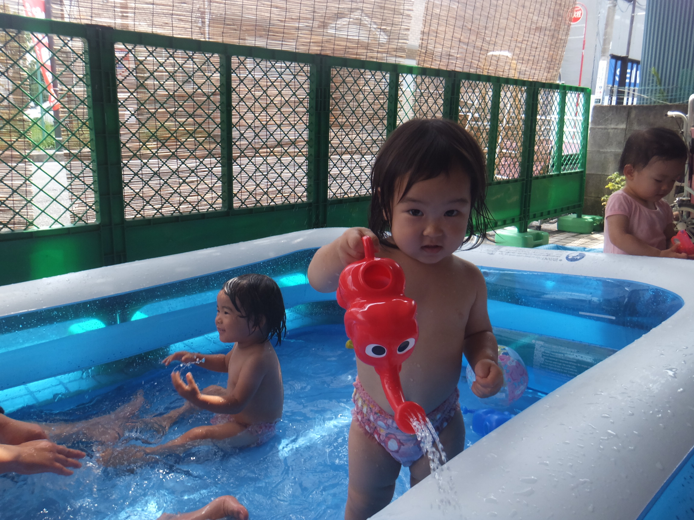 全身水につかってバタ足をしたり、ぞうさんじょーろやペットボトルのシャワーで霧吹きしたりして、今日も楽しかったね~!!