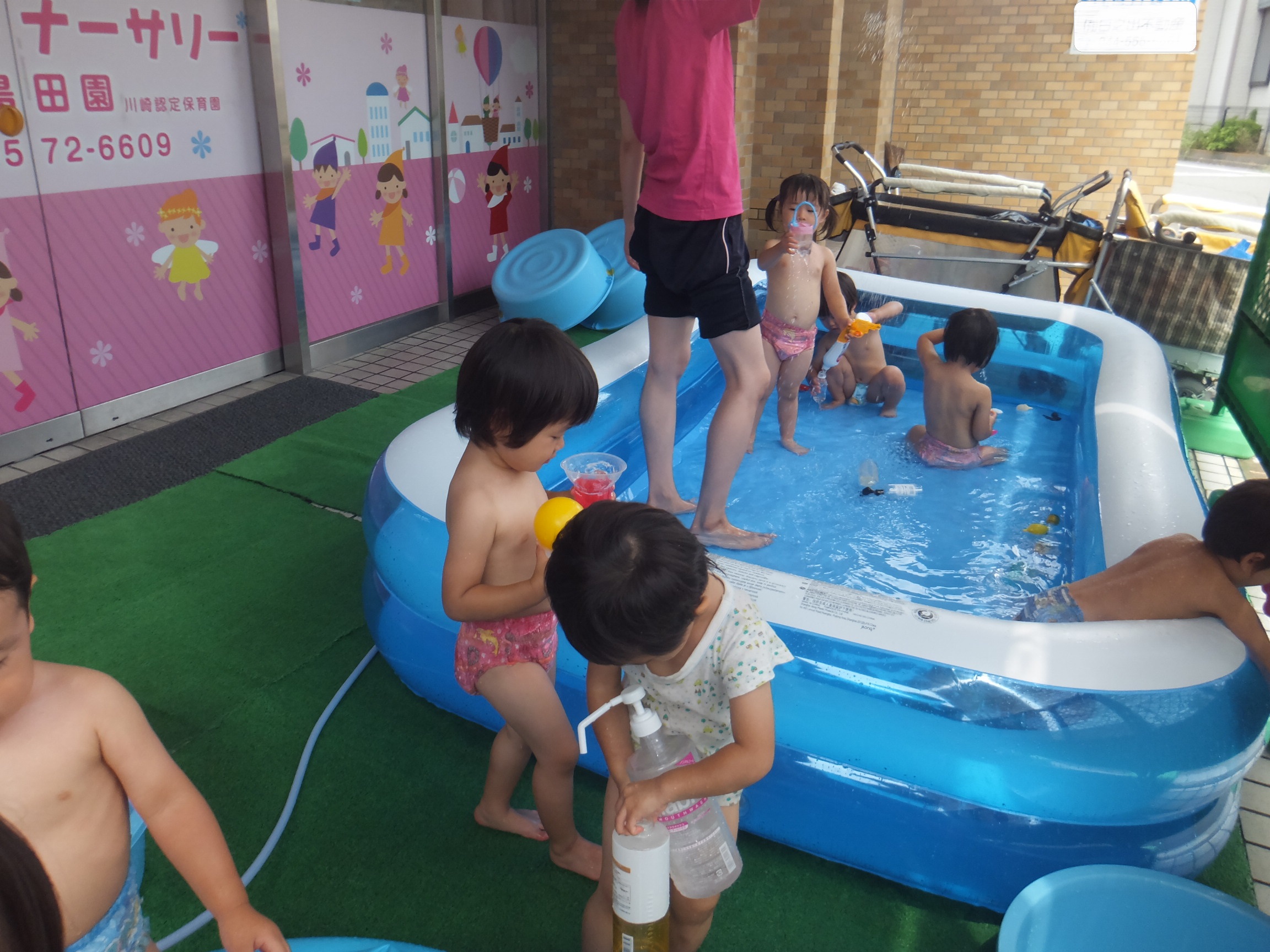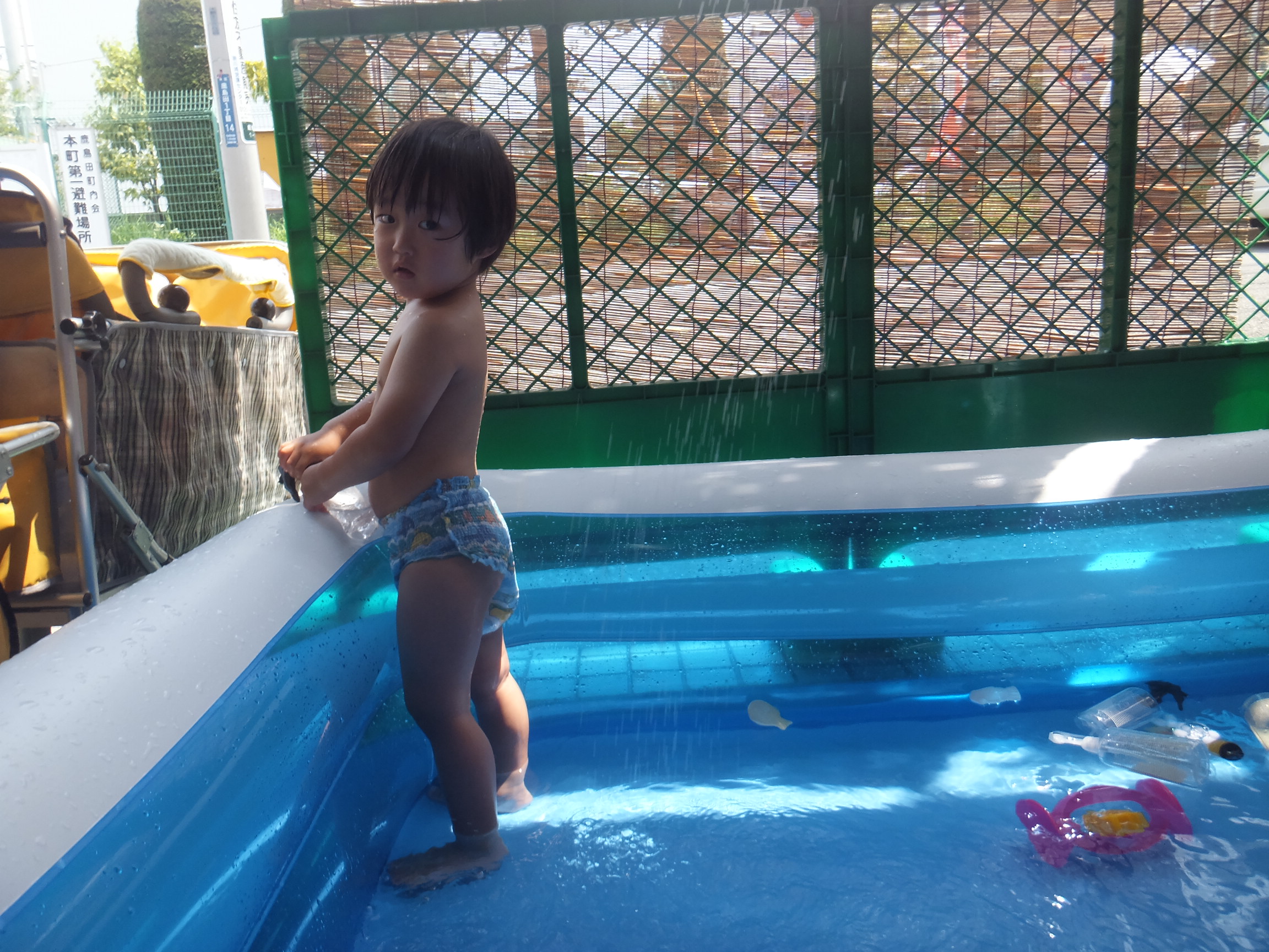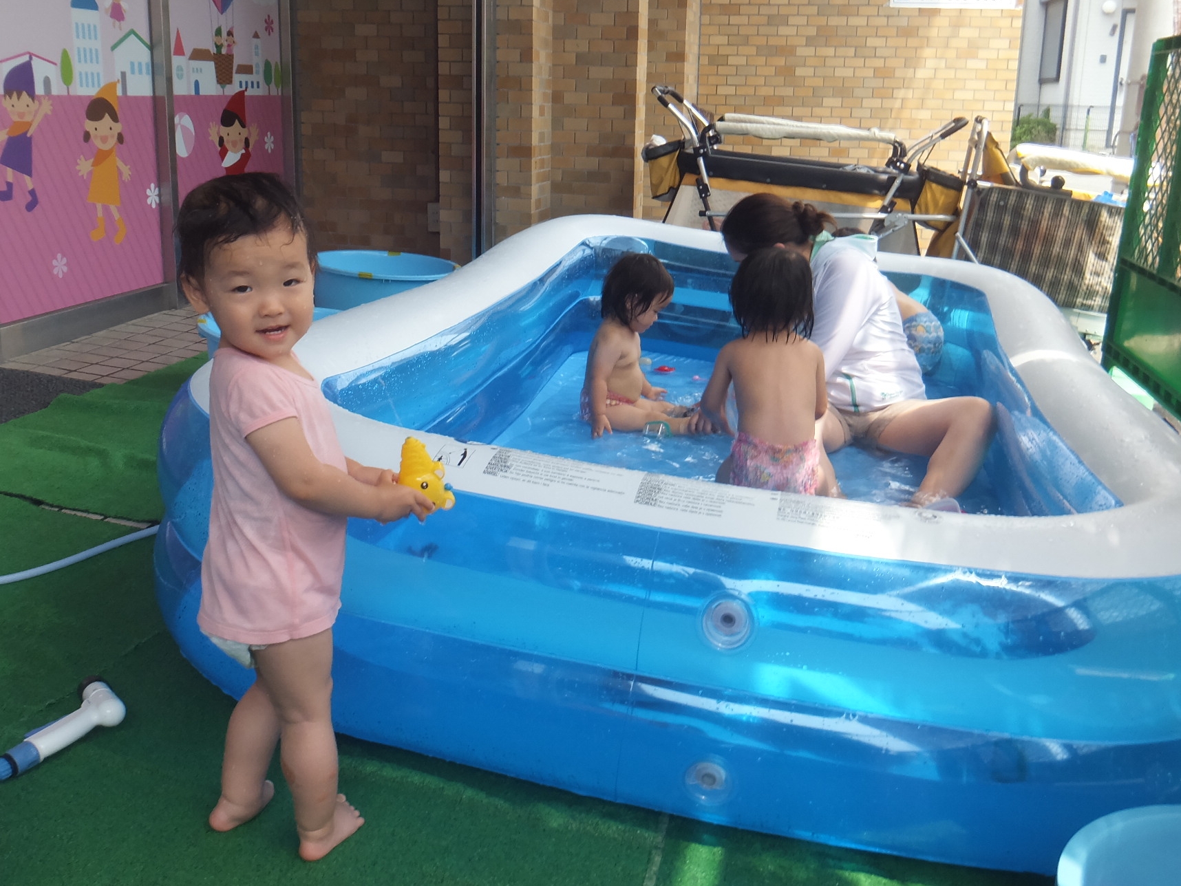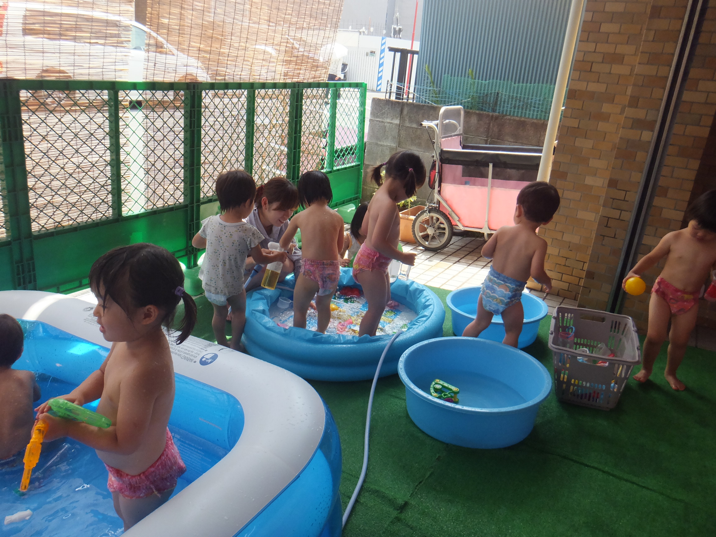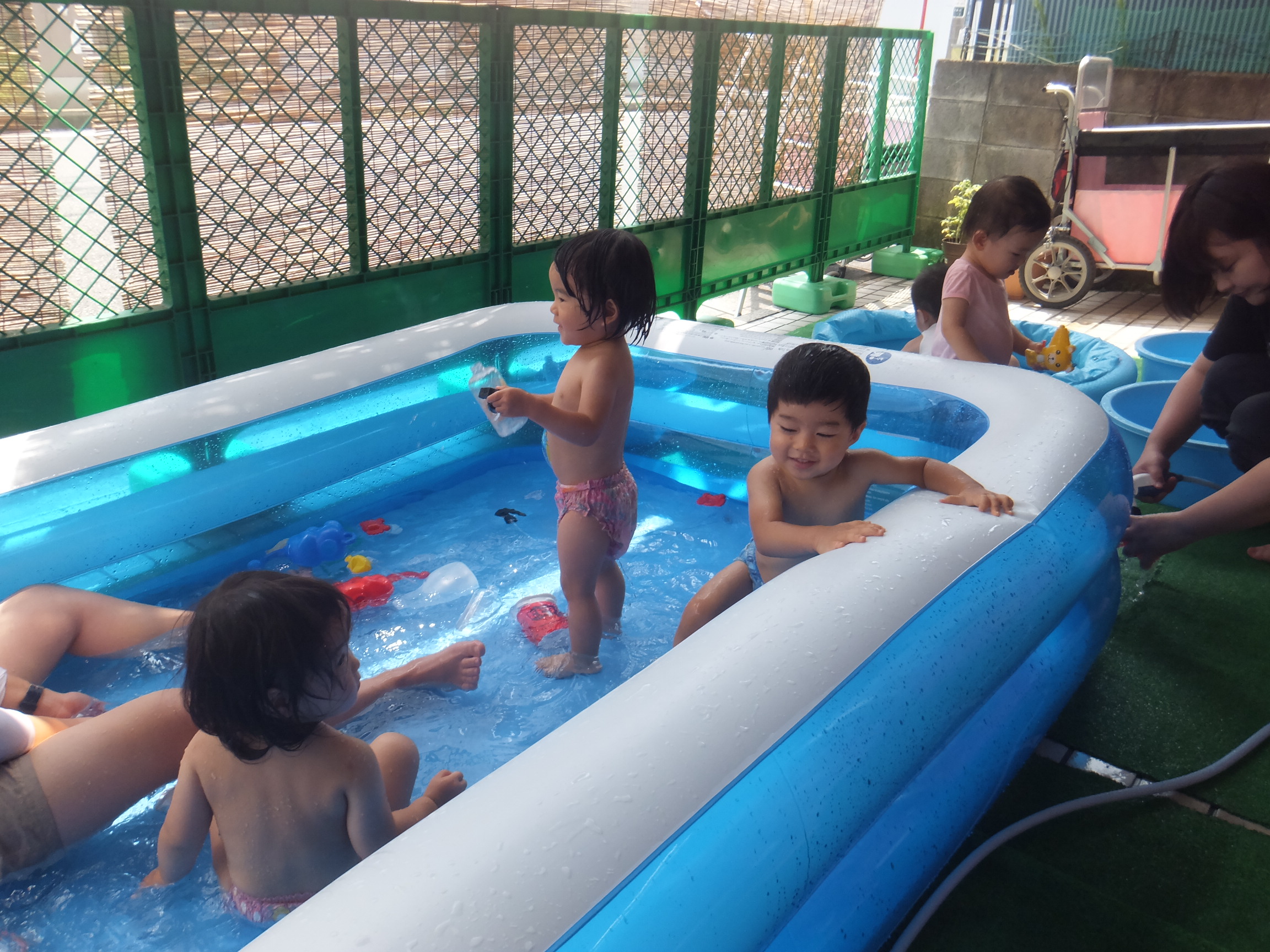 全身水につかってバタ足をしたり、ぞうさんじょーろやペットボトルのシャワーで霧吹きしたりして、今日も楽しかったね~!!