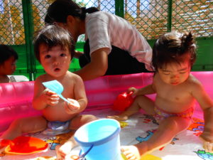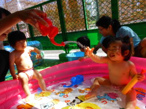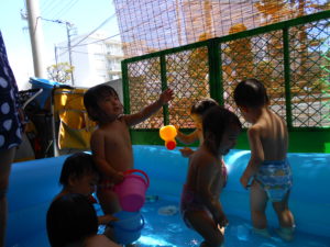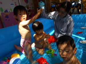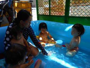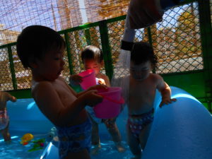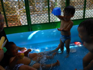 朝の会を終えると、いつものようにひよこ組さんからプール遊びスタート♬