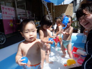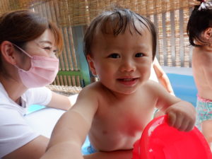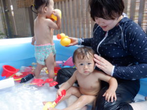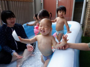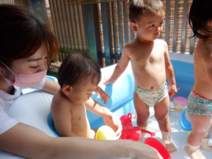 英語あそび中、うさぎ組さんは今日もプール遊び♬