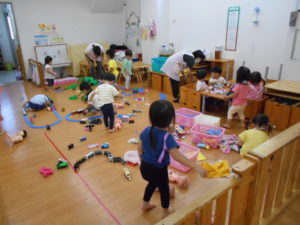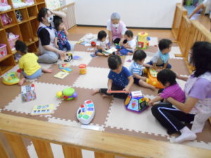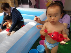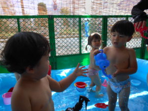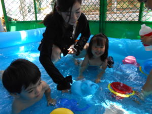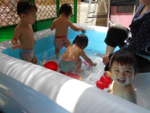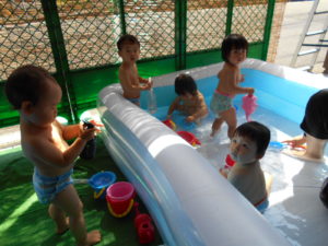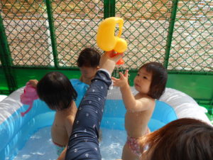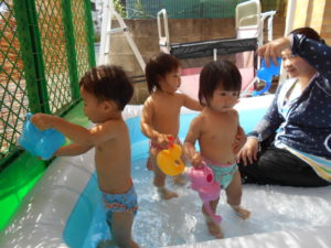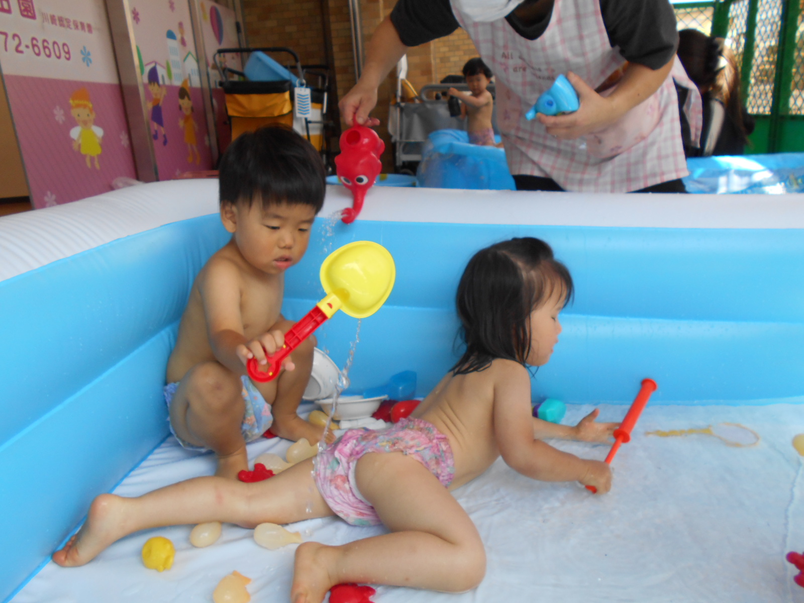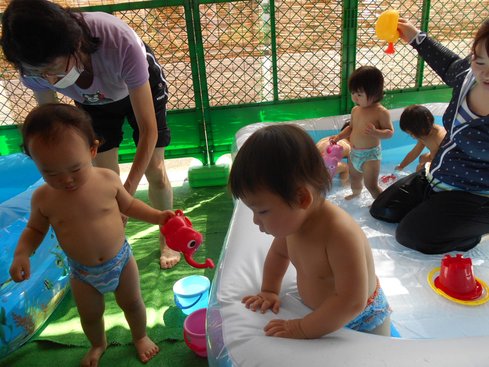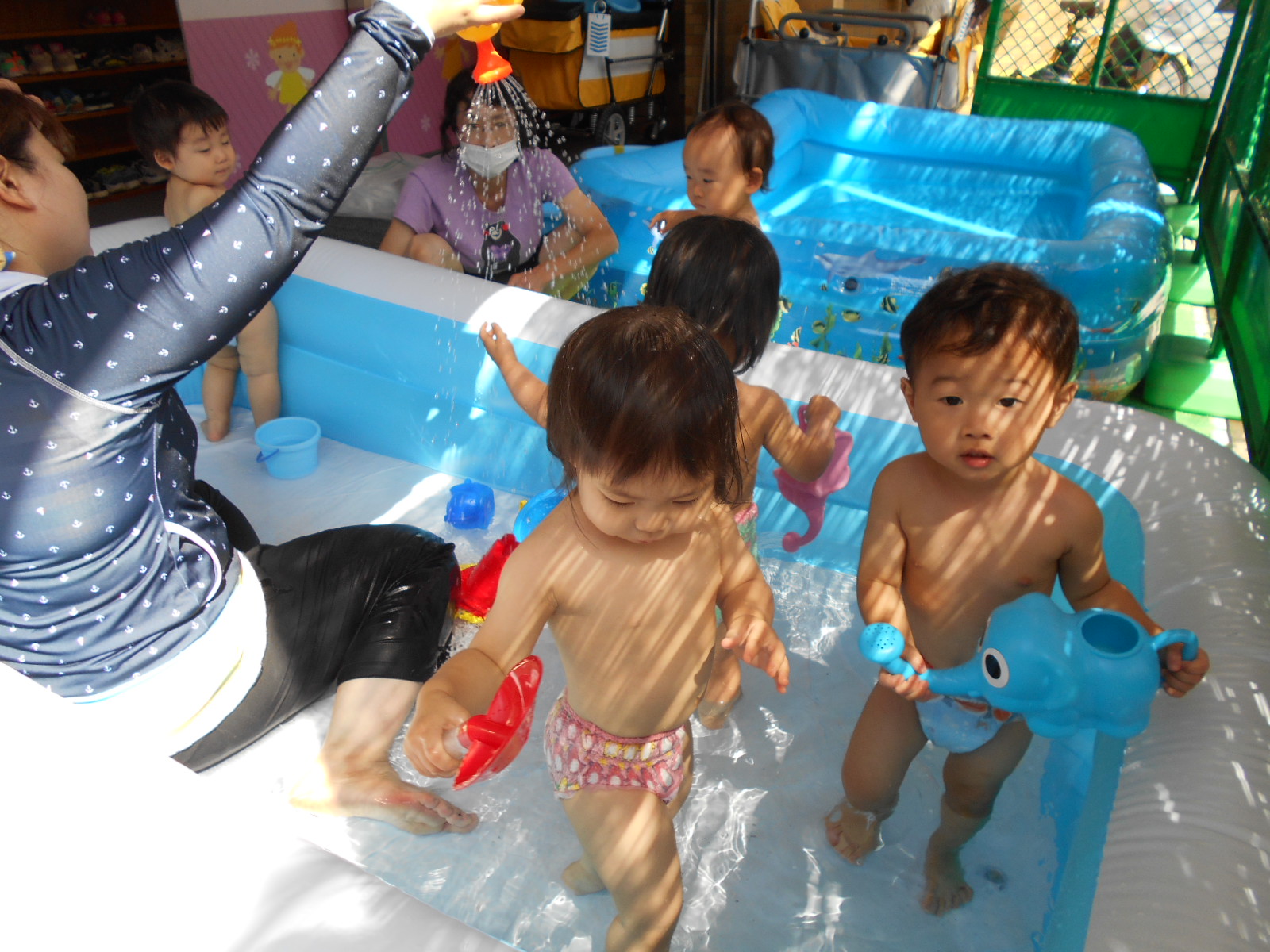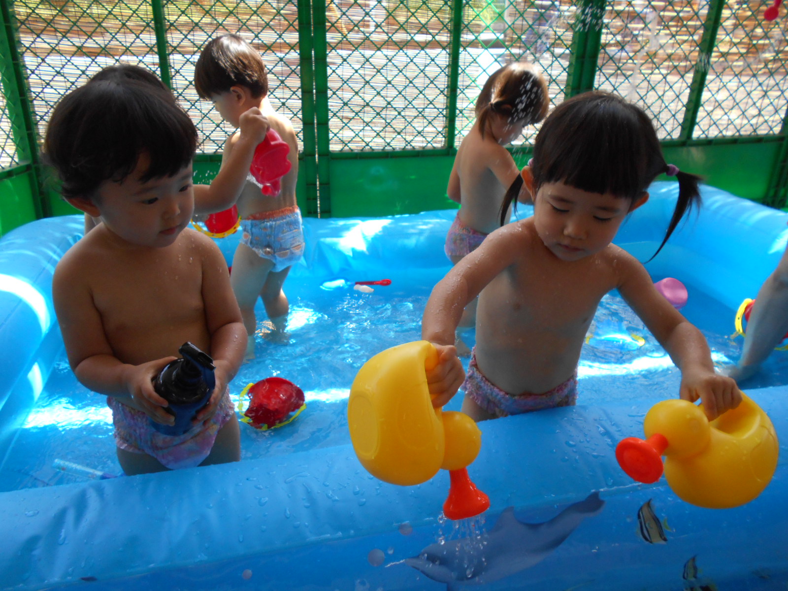 8月初は少し緊張気味だったお友だちも少しずつ慣れてきて、お水の中でおもちゃで遊んだり、プールの脇で冷たい雰囲気を感じたり。