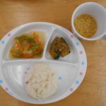 普通食「カラスカレイの野菜あんかけ」「かぼちゃと昆布のごま煮」「ヨーグルト」