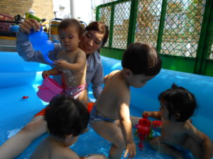 プールには進んで入るものの、立ったまま遊ぶお友達が多かったうさぎ組さんですが、