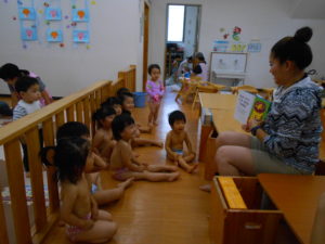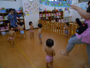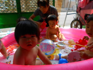 少しづづお座りして腰までつかったり、頭やお顔にお水がかかっても「大丈夫!」なお友達が増えてきました☺